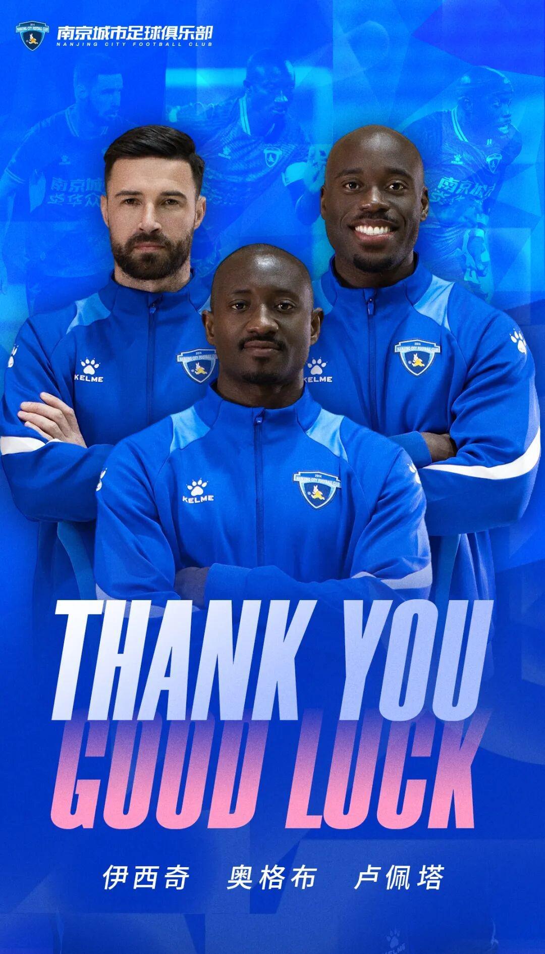 南京城市官方宣布,合同期满,经双方友好协商,球员奥格布、卢佩塔、伊西奇、齐雨熙、凌杰不再效力于南京城市足球俱乐部。南京城市足球俱乐部衷心感谢上述球员的付出与奉献,祝愿未来个人生活和职业道路一切顺利。