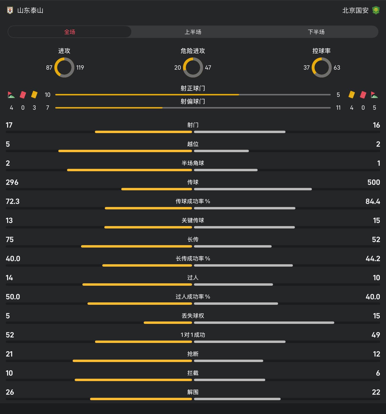 开云娱乐-山东泰山vs北京国安全场数据:射门17-16,控球率37%-63%