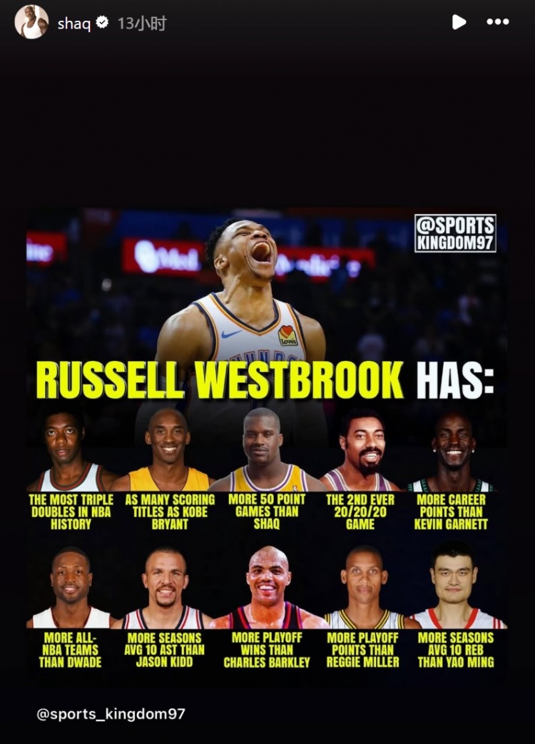 6月29日讯 今天,NBA名宿奥尼尔转发了一则关于威少多项数据荣誉的报道,详情如下: